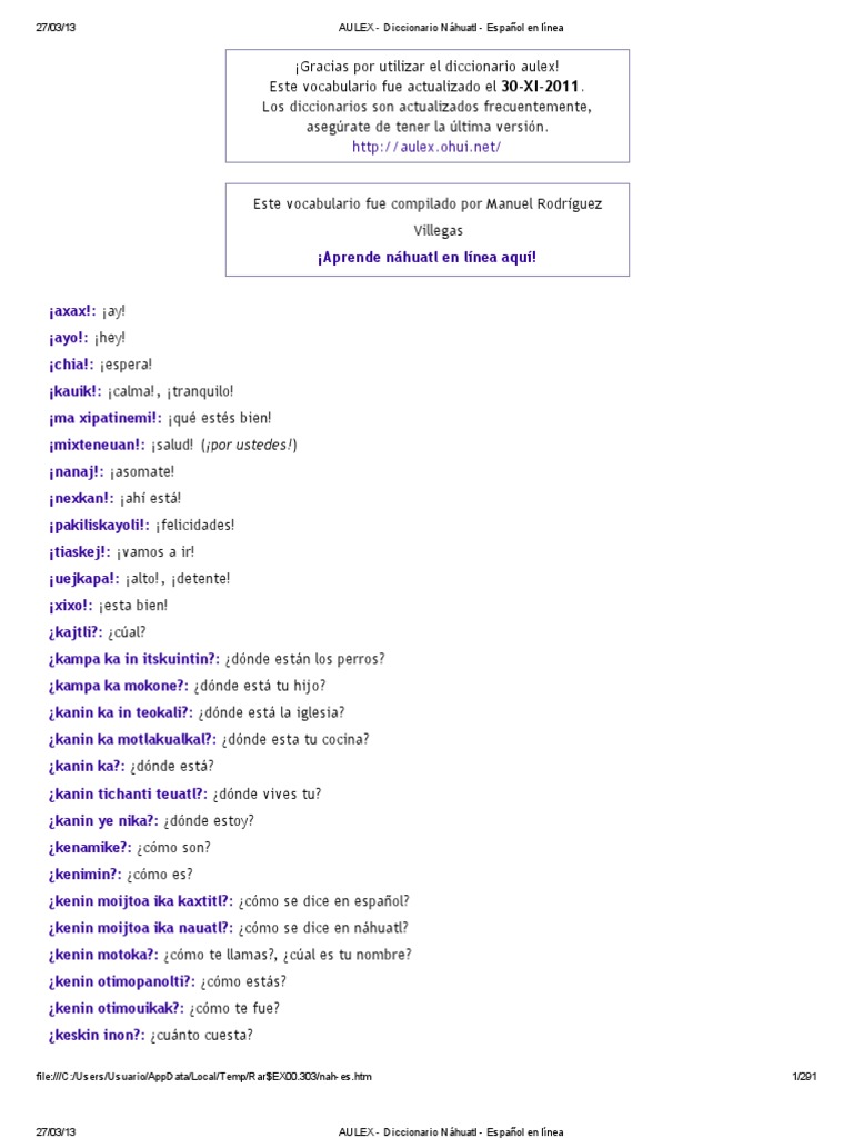 Aprende nhuatl en lnea aqu. Diccionario nhuatl-espaol en lnea para autodidactas Aulex con ms de once mil entradas y una versin para descargar. Esta forma de escribir el nhuatl perdura hasta nuestros das y se conoce a veces como nhuatl clsico o simplemente nhuatl.